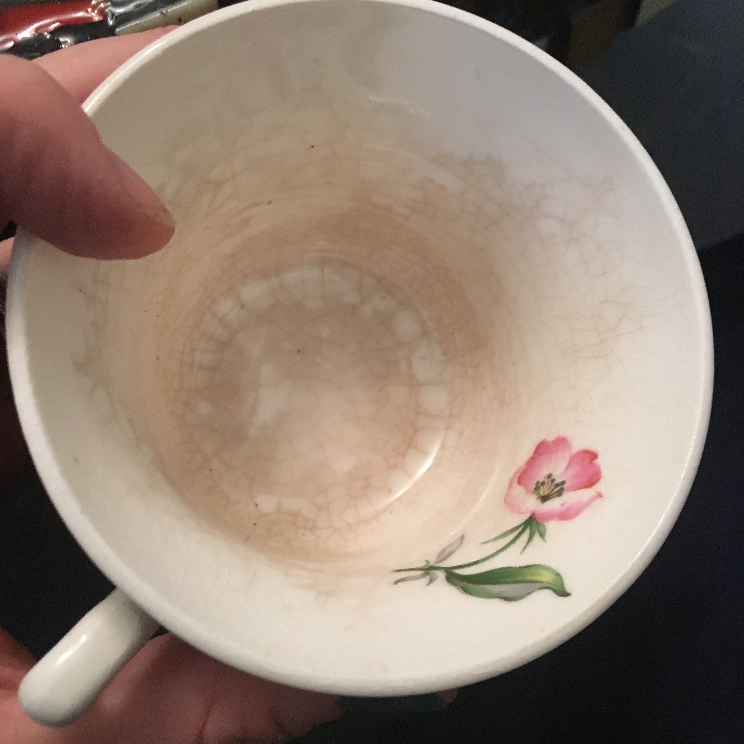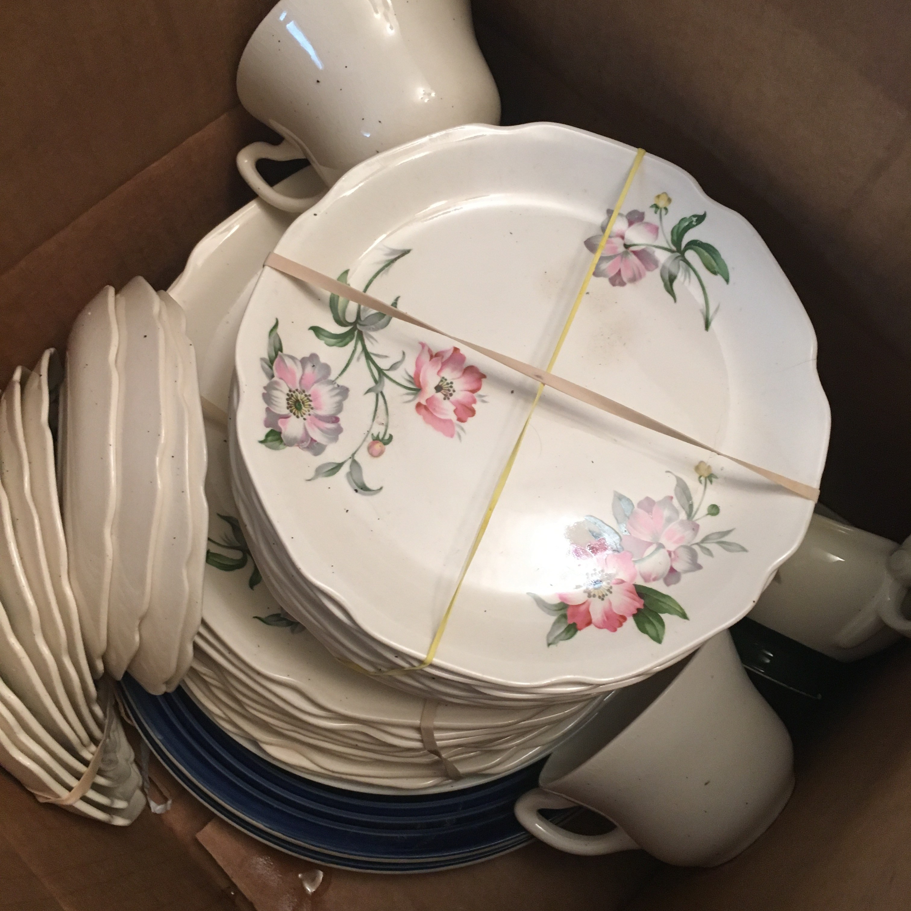 Recently I found an entire set of dishes that I couldn’t pass up. I usually steer clear of sets of dishes as even the Goodwill employees know that a full set of china is something special. However, this was closer to earthen-ware and not fine porcelain. It was also stained with years of coffee use and perhaps dishwashing as some crackle had come through.